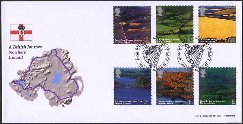 The second in a series of 10 sets of stamps in the series 'A British Journey' takes our journey over the water to Northern Ireland. The first set was The Beauty of Scotland issue in 2003, and a set featuring the landscape of Wales was be issued on 15 June 2004, and the series moved into England in January 2005.
