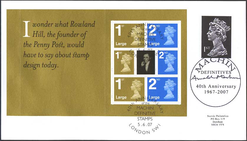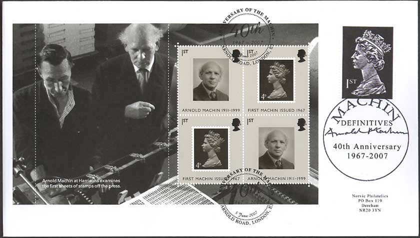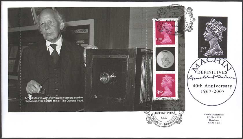 2007 marks the 40th anniversary of the issue of new Queen Elizabeth II definitives featuring Arnold Machin's iconic bas-relief sculpture that replaced the Wilding definitives. Arnold Machin's 1967 portrait of Queen Elizabeth II (sometimes referred to as the Machin head) has been reproduced over 175 billion times