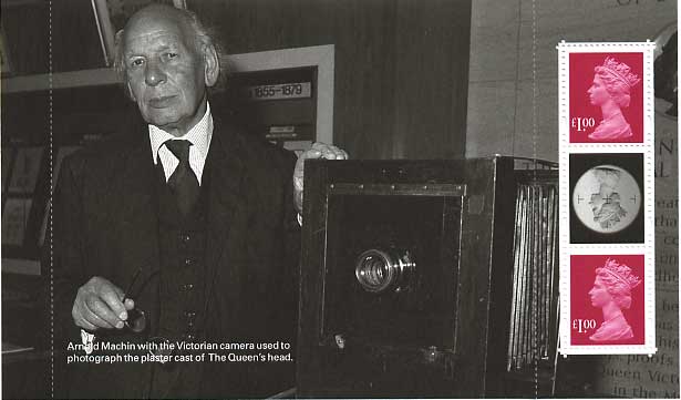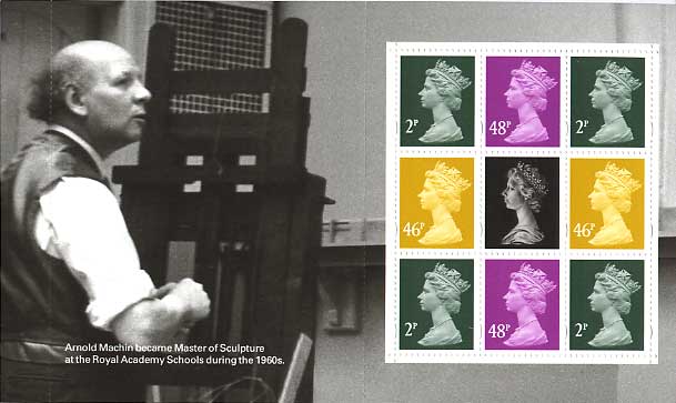 Accompanying the miniature sheet is a Prestige Stamp Book which tells the story of the development of the Machin in Arnold Machin's own words. Click on each pane to see a large image in a new window/tab.