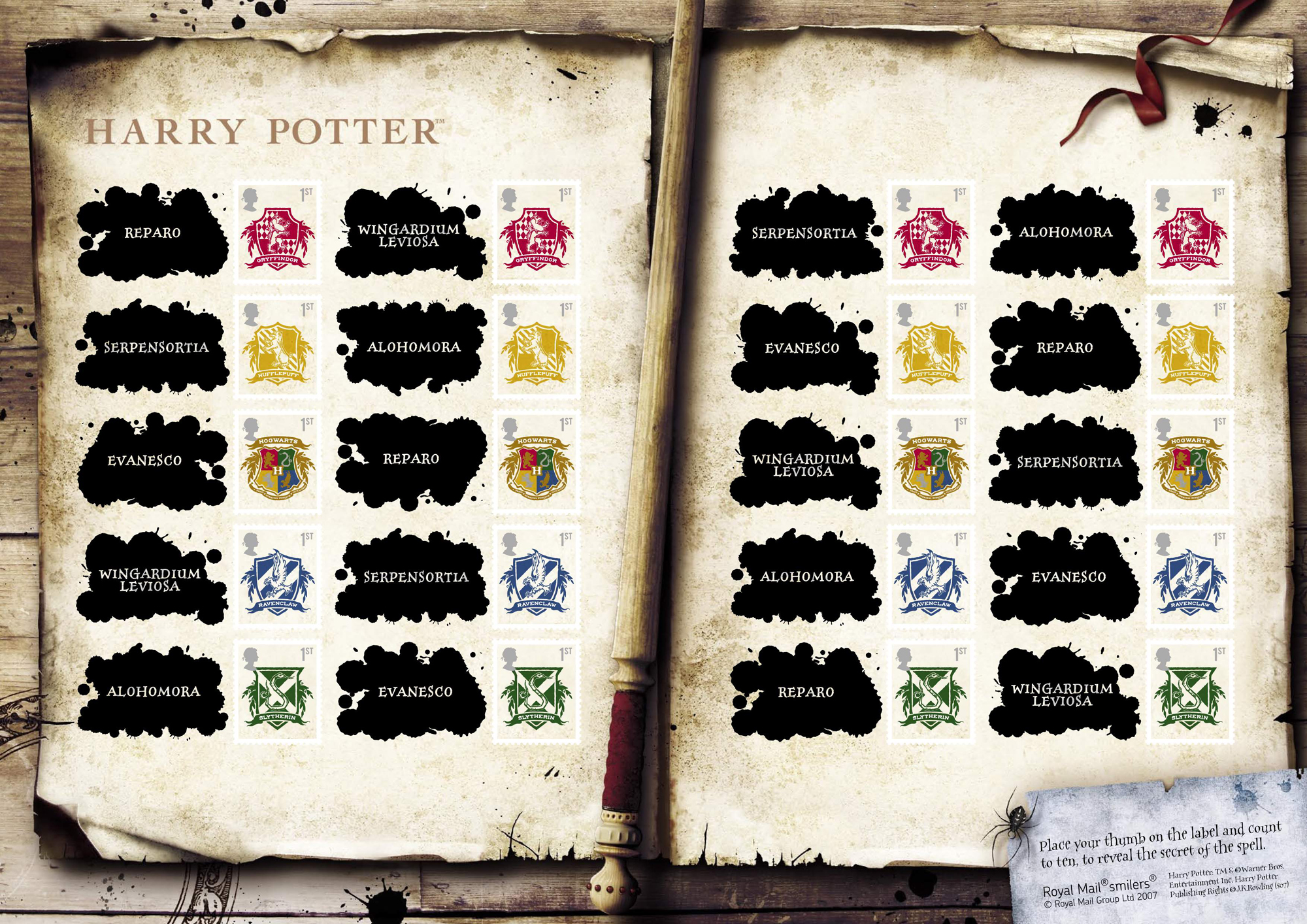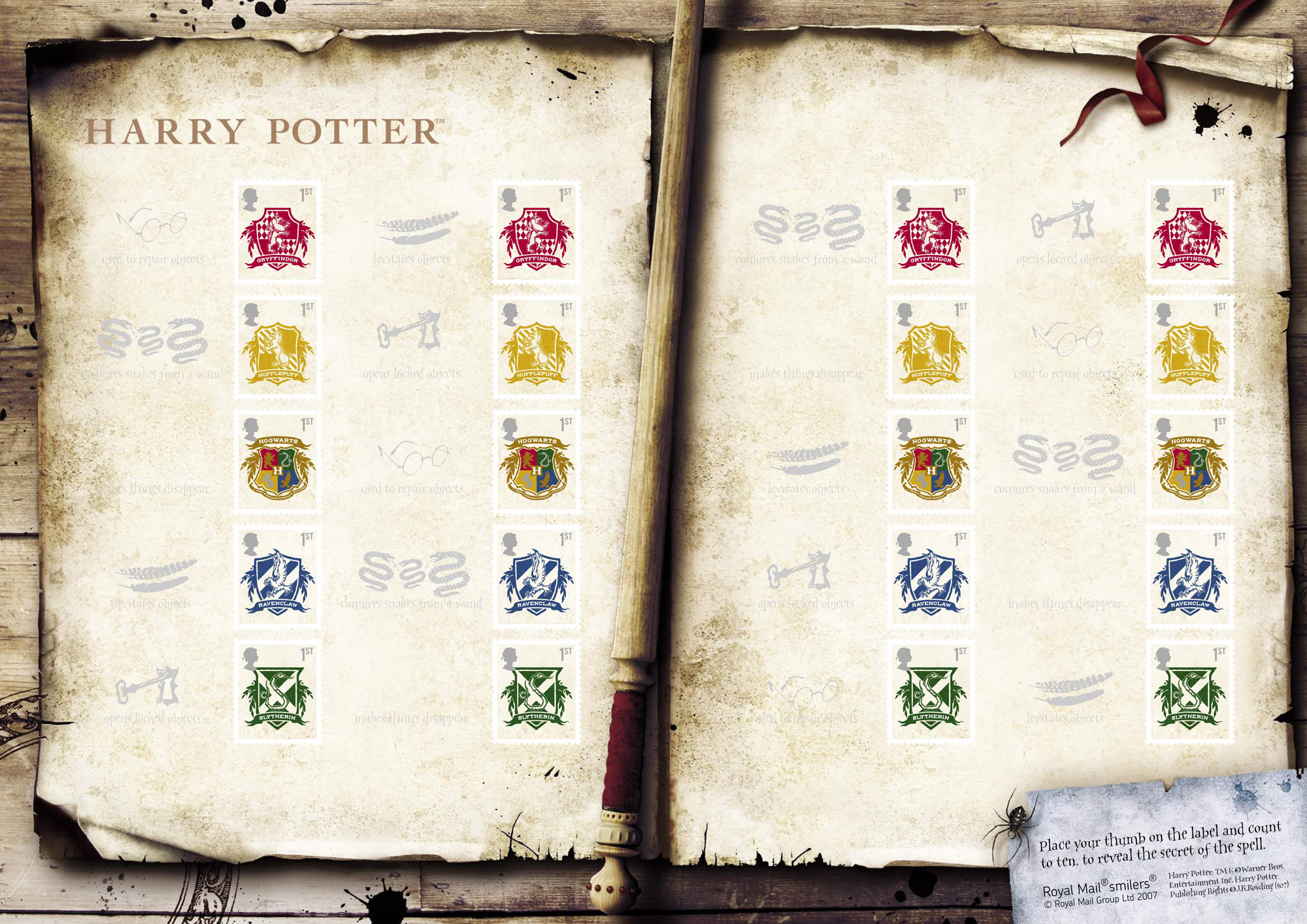 The publication of Harry Potter And The Deathly Hallows marks the completion of J.K. Rowling's Harry Potter saga and Royal Mail is marking this with the issue of a set of 7 stamps featuring the book covers. A miniature sheet of 5 stamps depicting the Hogwarts School Crest and the crest of the 4 houses was also issued.