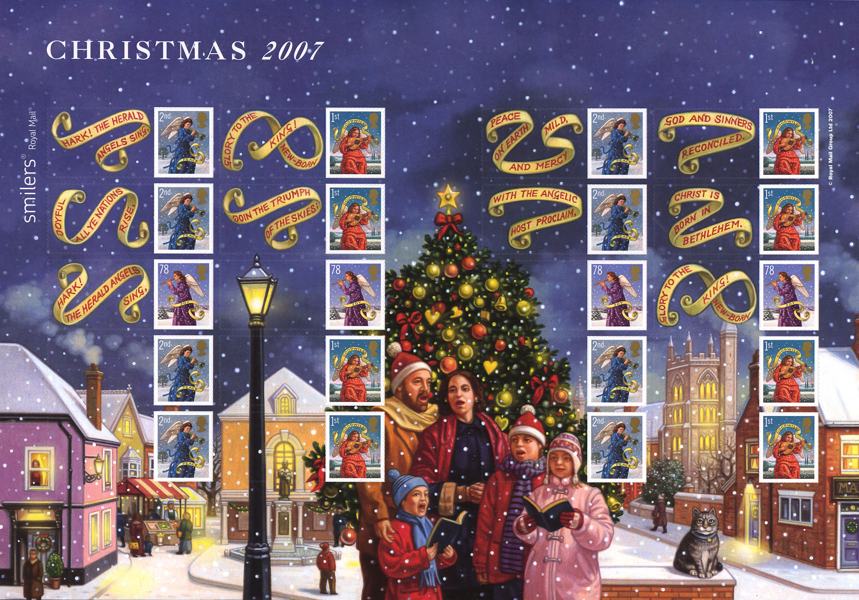 The generic self-adhesive Smilers® Sheet was designed by Rose Design and comprises 20 stamps: 8 x 1st class, 8 x 2nd class and 4 x 78p stamps set within a border and labels illustrated by Marco Ventura. The background features a snow scene with carol singers; thematic features include a cat, church, & Christmas Tree. The Smilers sheets are printed in litho by Cartor Security Printers. Click on the image for a larger one in a new window.