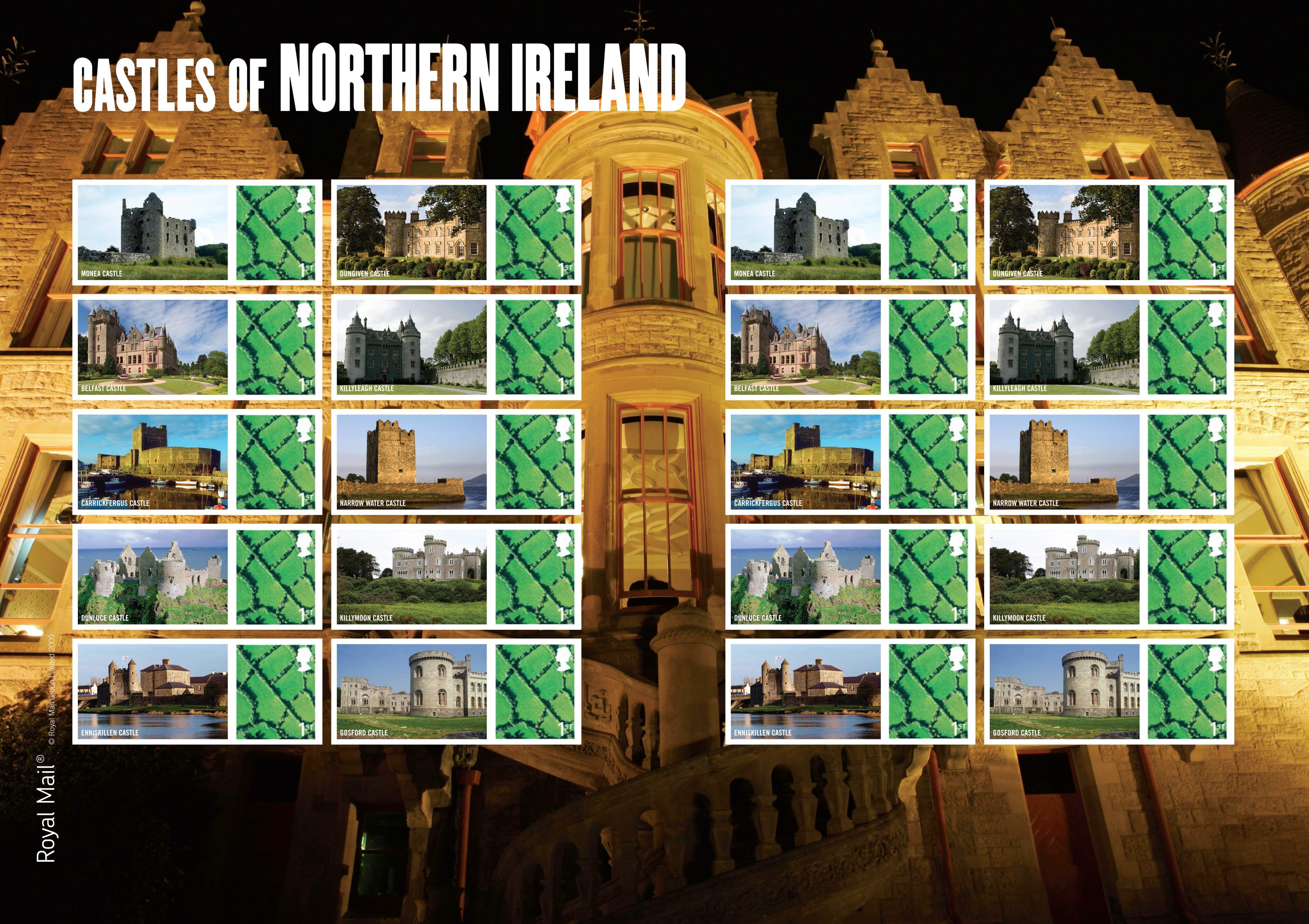 The first in what we assume will be a new five-sheet series of Smilers Sheets is a surprise addition to an already very busy March 2009 programme. Using the 1st class Northern Ireland definitive the sheet shows 2 panes of 10 castles of Northern Ireland. Click on the image here to see a much larger one in a new window.