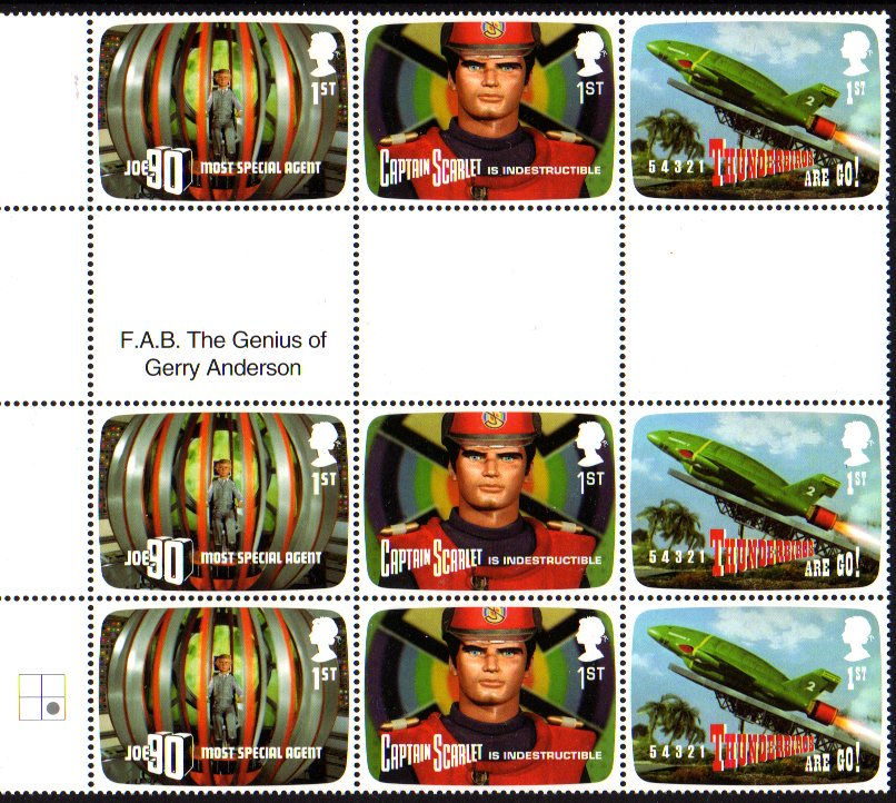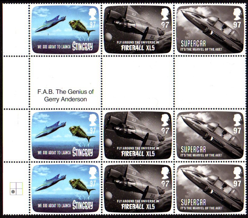 stamps are in se-tenant strips of 3 (x2) within the sheet. Click on links below for 1st & 97p blocks. Stamp designs: 1st class - Joe 90 - 1968 to 1969 1st class - Captain Scarlet - 1967 to 1968 1st class - Thunderbirds - 1965 to 1966 97p - Stingray - 1964 to 1965 97p - Fireball XL5 - 1962 97p - Supercar - 1961 to 1962 The stamps are in reverse chronological order. |