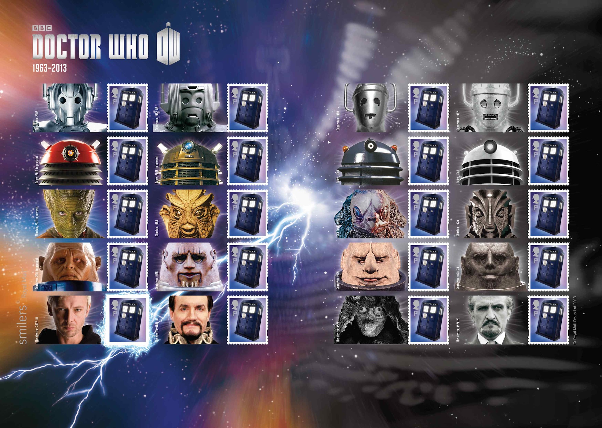 Generic Smilers Sheet. 20 x 1st class Tardis stamps with labels depicting 4 versions of each of 5 of the the Doctor's enemies. Cyberman 1967, 1968, 1982-85 and 2006 Dalek 1963, 1984, 2005 to date, 2010 to date Silurian 1970, Sea Devil 1972, Silurian 1984, and 2011 to date Sontaran 1973-74, 1975, 1985, and 2011 to date. The Master 1971-73, 1976, 1981-89, 2007+10 |