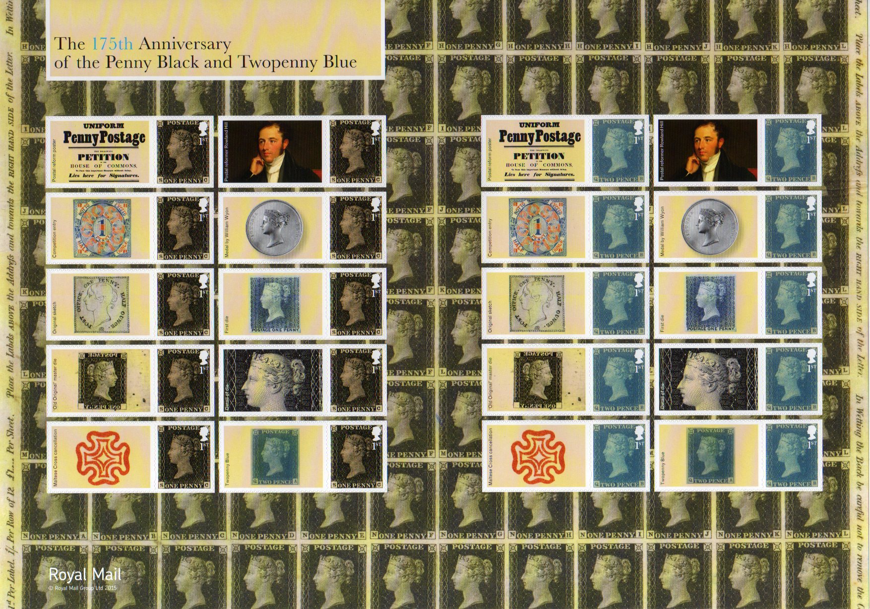 Royal Mail is celebrating the 175th anniversary of the Penny Black and the Twopenny Blue by issuing a miniature sheet that includes images of the two stamps, each one appearing twice, with 1st class values. The miniature sheet border features a photograph of the printing presses at Perkins, Bacon & Petch, who printed all the original stamps.